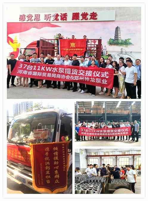 河南国际贸易网商协会、三亚书杰环境科学技术有限公司水泵提货交接,未来路街道赠神龙排涝突击队锦旗