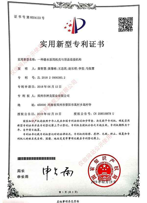 井用潜水电动机专利证书